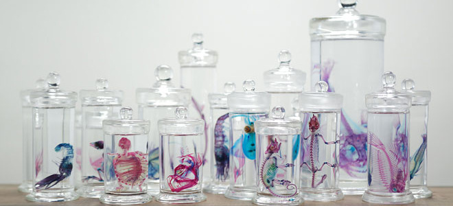 Μπορούν τα ψάρια να γίνουν έργο τέχνης; Σύμφωνα με τον Ιάπωνα Iori Tomita μπορούν! Χρησιμοποιώντας τις γνώσεις του στην ιχθυολογία, ο Γιαπωνέζος καλλιτέχνης χρησιμοποιεί «μοντέλα» ψαριών και οστρακοειδών, από τα οποία έχει αφαιρέσει τα λέπια και το δέρμα, και με μια περίπλοκη τεχνική τα βάφει με φανταχτερά χρώματα.Ο Tomita χρησιμοποιεί ψάρια που διατηρούνται στη φορμαλδεΰδη και, αφού τα «ποτίσει» με ένα ειδικό ένζυμο (τρυψίνη) που αποσυνθέτει τα μαλακά μέρη τους, τα τοποθετεί σε ένα μείγμα χημικών που σταματά τη διαδικασία της αποσύνθεσης ακριβώς τη στιγμή που γίνονται διάφανα και λίγο πριν χάσουν εντελώς τη μορφή τους.Στη συνέχεια, βάφει τα κόκκαλα τους με κόκκινο χρώμα και τα βάζει σε βαζάκια γλυκερίνης. Η διαδικασία αυτή μπορεί να διαρκέσει από 5 μήνες μέχρι ένα χρόνο, αλλά το τελικό αποτέλεσμα είναι εντυπωσιακό. Δείτε τις φωτογραφίες....